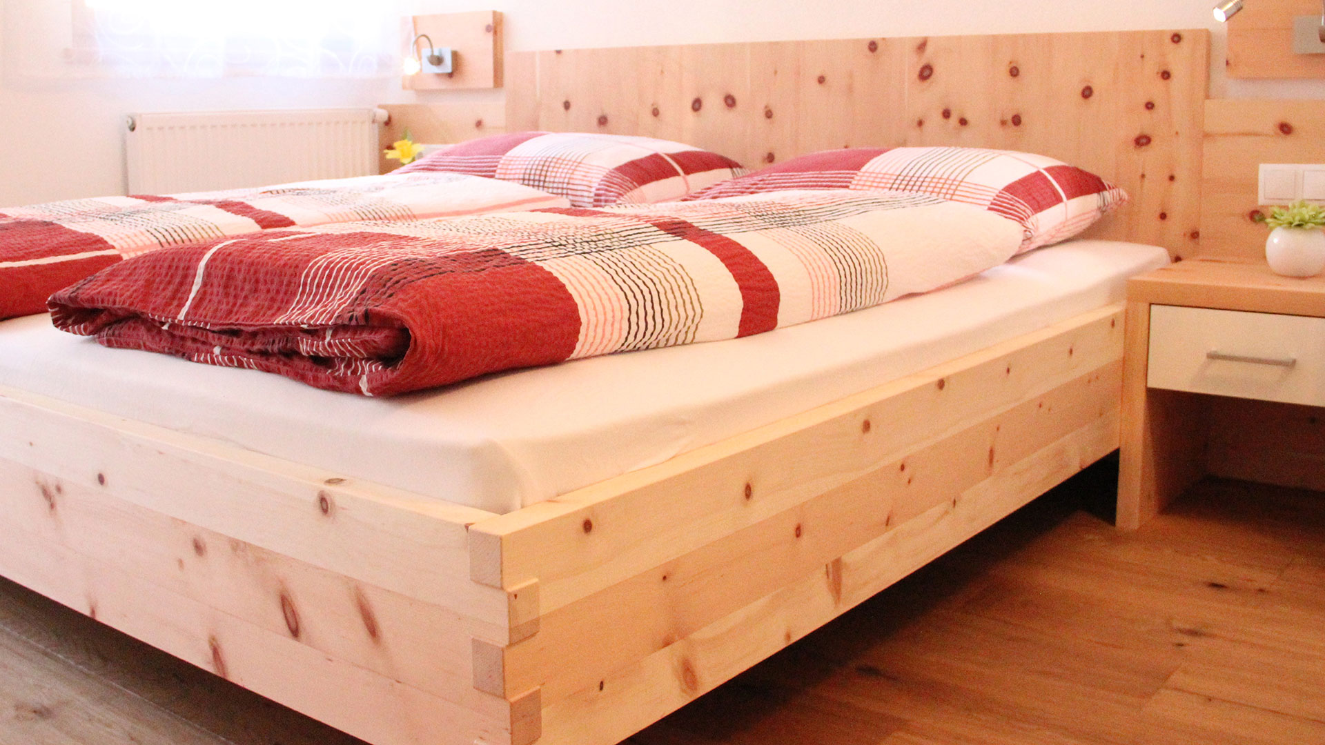 • Schlafzimmer - tischlergefertigte Einrichtung aus Zirmholz; Bettwäsche inklusive