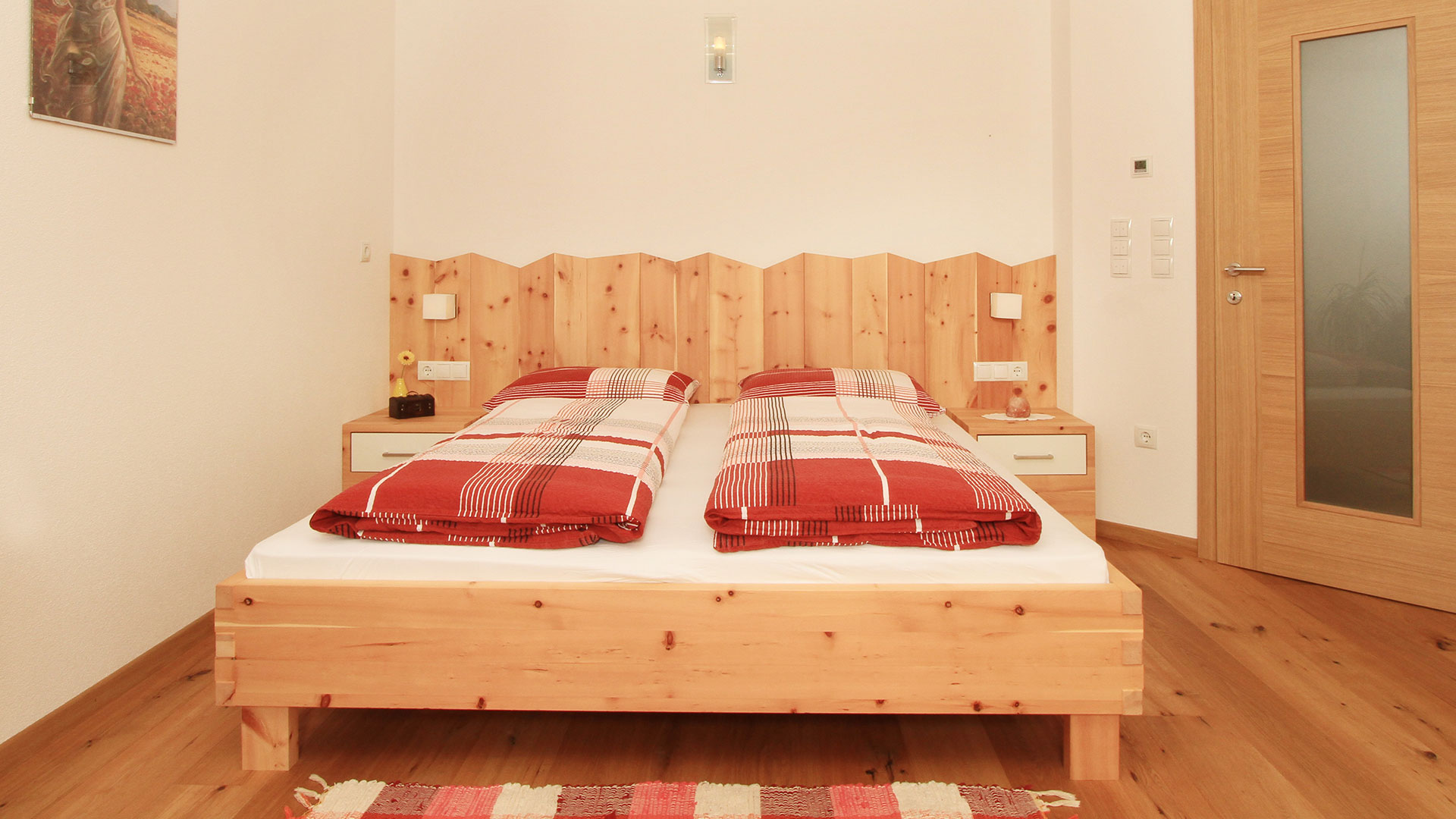 • Schlafzimmer - tischlergefertigte Einrichtung aus Zirmholz; Bettwäsche inklusive