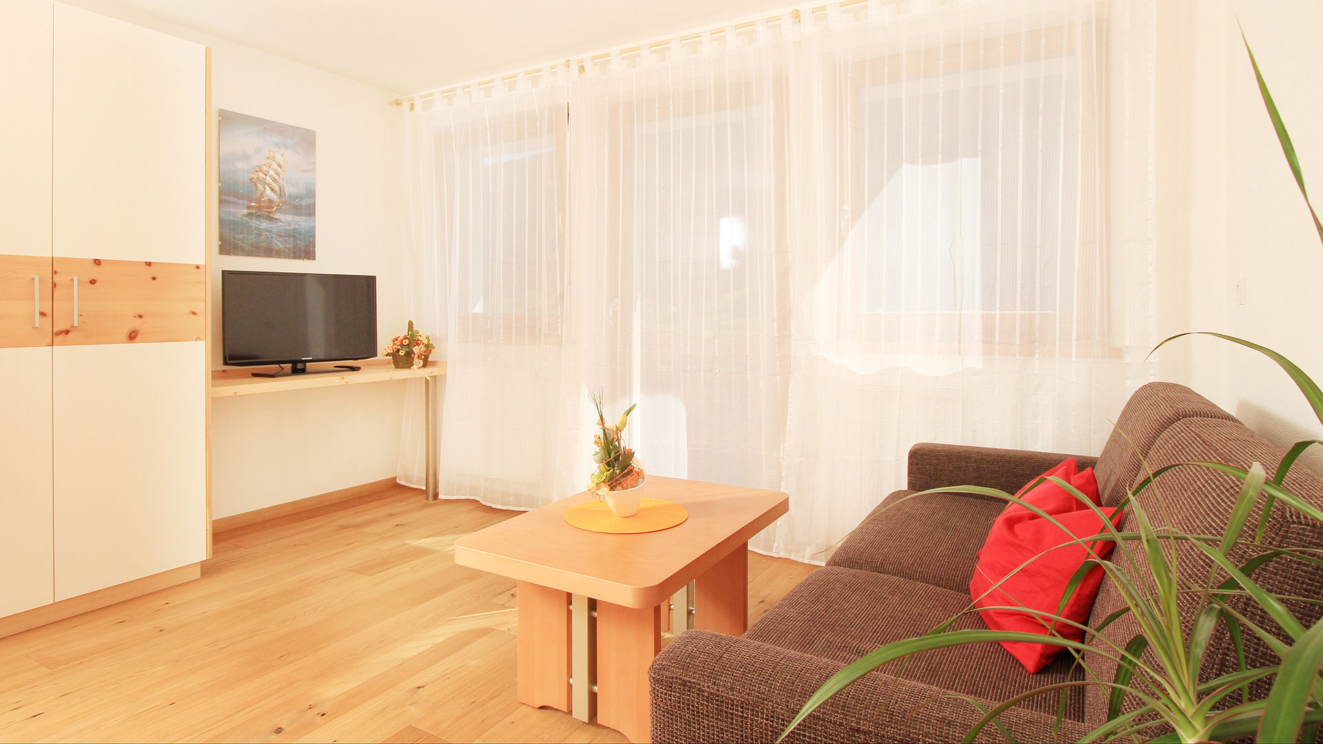 • Wohnzimmer mit ausziehbarer Couch und Sat TV (Schlaf - und Wohnzimmer sind in einem gemeinsamen Raum)
