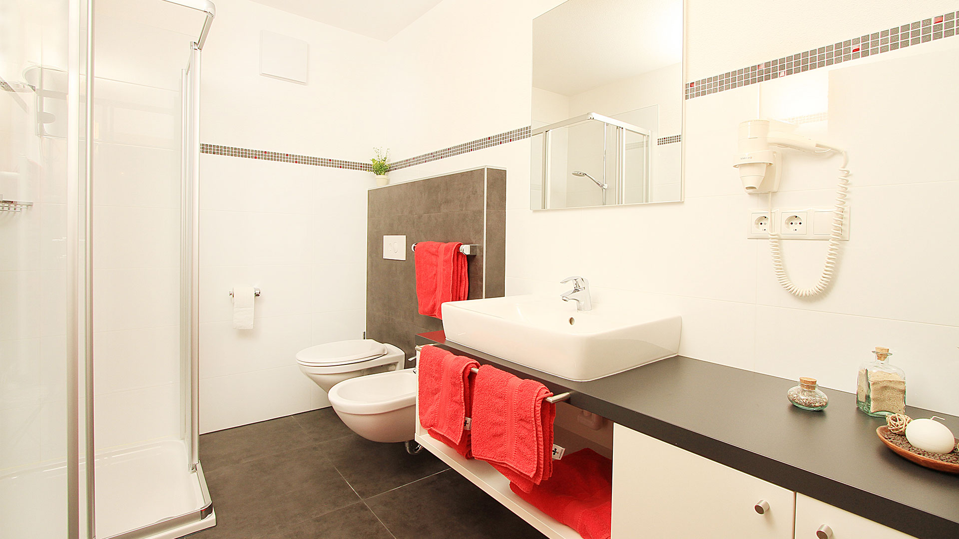 • Badezimmer mit Dusche / Badewanne, Haartrockner, Seife, Duschgel / Shampoo
